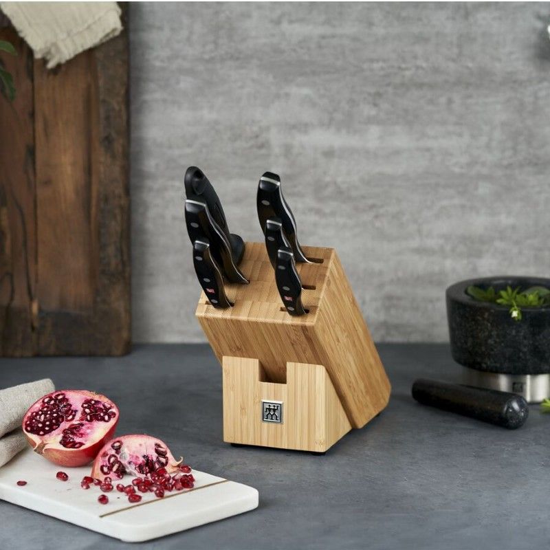 Was die Zusammenstellung Ihrer gewünschten Messer anbelangt, haben Sie beim Zwilling 4 Sterne Messerblock und Pro Messerblock die gleichen Freiheiten. Aus Holz oder Bambus gefertigt, führt der Hersteller sechs- bis achtteilige Sets mit Garniermessern, Fleischmessern, Brotmessern und mehr. Neben Schneidmessern für alle gängigen Lebensmitteln steckt in größeren Sets eine Schere mit im Block. Überlegen Sie hier, ob Sie diese ebenfalls für die täglich anfallenden Arbeiten in Ihrer Gastroküche benötigen.